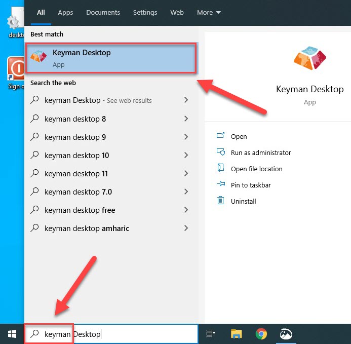 Click in the Search area and type "keyman" then click on the Keyman Desktop App link