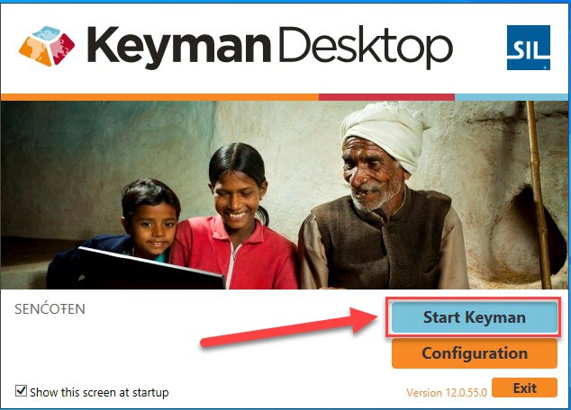 On the Keyman Desktop Splash Screen Click Start Keyman. Your windows machine may offer an update for Keyman. Please ignore or cancel this update message.